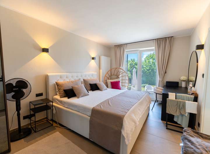 Der Platz in der separaten Küche wurde optimal ausgenutzt: Eine hochwertige Einbauküche mit deckenhohen Schränken bietet nicht nur viel Stauraum, sondern auch eine elegante, moderne Optik. Daran angeschlossen ist der große Essbereich und das Wohnzimmer mit Zugang zur Terrasse und dem großflächigen Garten – ein echtes Highlight für Familien und Gartenliebhaber. Das Elternschlafzimmer mit eigenem Badezimmer en suite bietet einen privaten Rückzugsort.