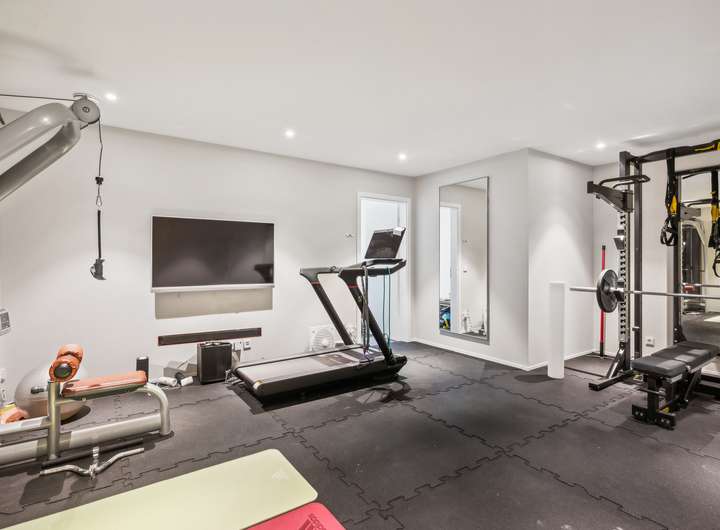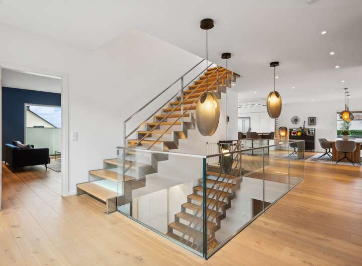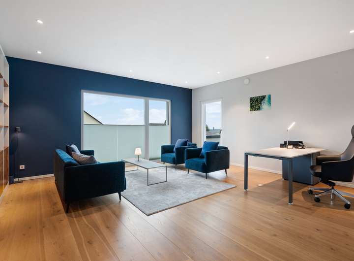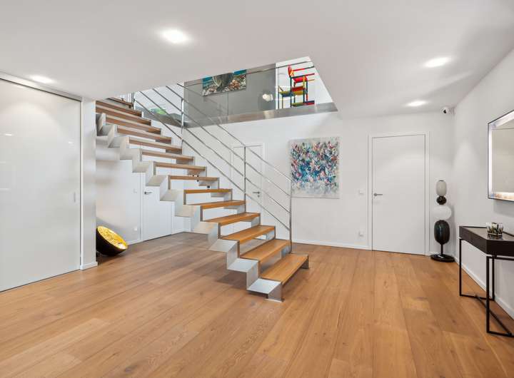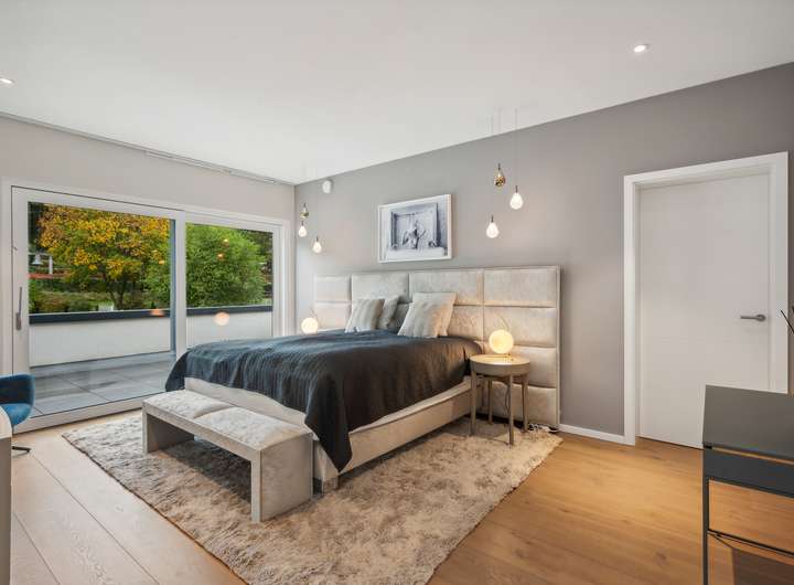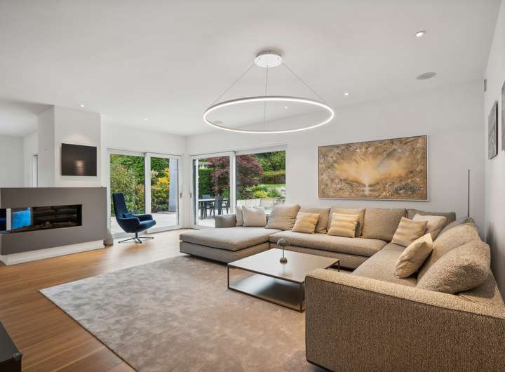 Im Parterre befinden sich ein Gästezimmer mit eigenem Bad, ein schallgedämmter Fitnessraum, sowie die üblichen Nutzräume und eine geräumige Garage. Diese bietet Platz für bis zu vier Fahrzeuge und ermöglicht den direkten Zugang zum Haus. Die sofort bezugsbereite Villa verspricht mit Ihrem durchdachten Konzept, den außergewöhnlichen Deckenhöhen, modernster Haustechnik/Smart-Home und innovativem Beleuchtungskonzept höchsten Komfort.