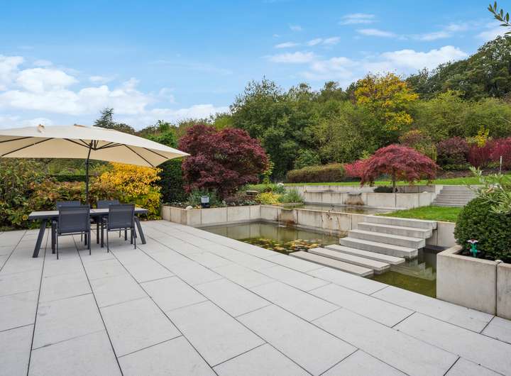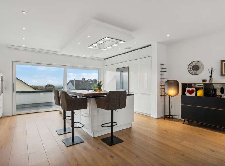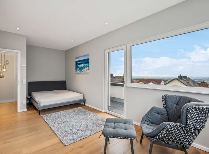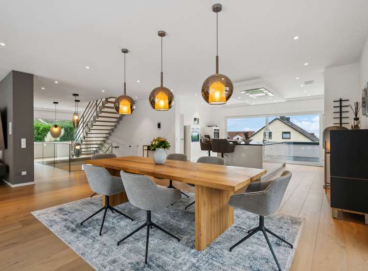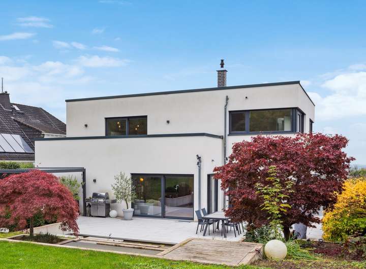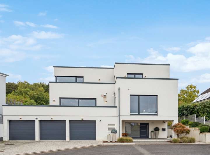 Diese moderne Villa in Bestlage von Friedrichsdorf - dem „Dillinger Hang“ - verkörpert exklusives Wohndesign und bietet ein perfektes Wohlfühlambiente. Die Architektur besticht durch eine klare, minimalistische Gestaltung, die in Kombination mit hochwertigen Materialien eine harmonische Atmosphäre schafft. Der offene Grundriss und die großzügigen Flächen lassen die Räume einladend wirken. Bereits beim Betreten des Hauses beeindruckt das lichtdurchflutete Entrée, eine freistehende Designtreppe führt in den zentralen Wohnbereich, der das Herzstück des Hauses bildet. Die repräsentative weitläufige Wohnetage ist geprägt durch einen modernen Grundriss mit bodentiefen Fenstern, einem großen Essbereich mit einer Designerküche sowie einem Panorama-Gaskamin, der für eine behagliche Stimmung sorgt. Vom Wohn- und Essbereich aus gelangt man direkt auf die sonnige Terrasse und in den geschmackvoll, geradlinig angelegten Garten. Der weitläufige, auf mehreren Ebenen terrassierte Außenbereich mit Wasserspiel verspricht erholsame Sonnenstunden in der Natur.
