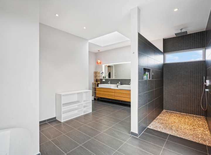 Im Obergeschoss der Villa befinden sich zwei funktionelle und große Kinderzimmer, die jeweils direkten Zugang in ein gemeinsames Bad haben. Der Elternbereich umfasst eine eigene Ankleide sowie ein geräumiges Badezimmer en Suite mit freistehender Badewanne und Zugang zu einer exklusiven Dachterrasse.