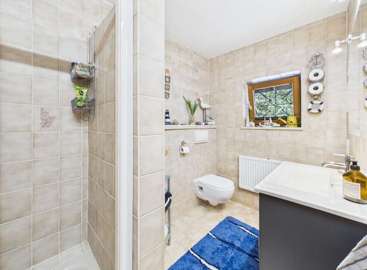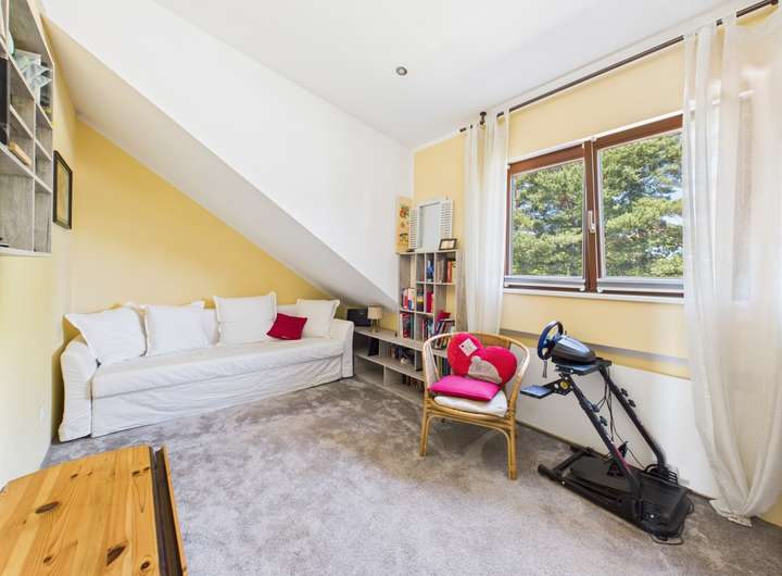 Das Haus verfügt über sechs Zimmer davon vier Schlafzimmer, die sich flexibel gestalten lassen – ob Arbeitsräume, Kinderzimmer oder Rückzugsorte. Ein ausbaufähiger Speicher mit rund 80 m² Fläche bietet weiteres Entwicklungspotenzial.