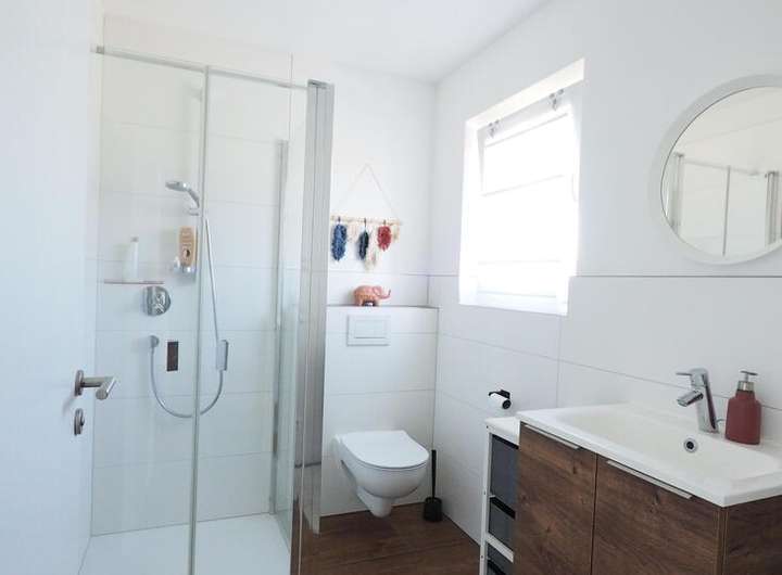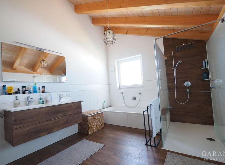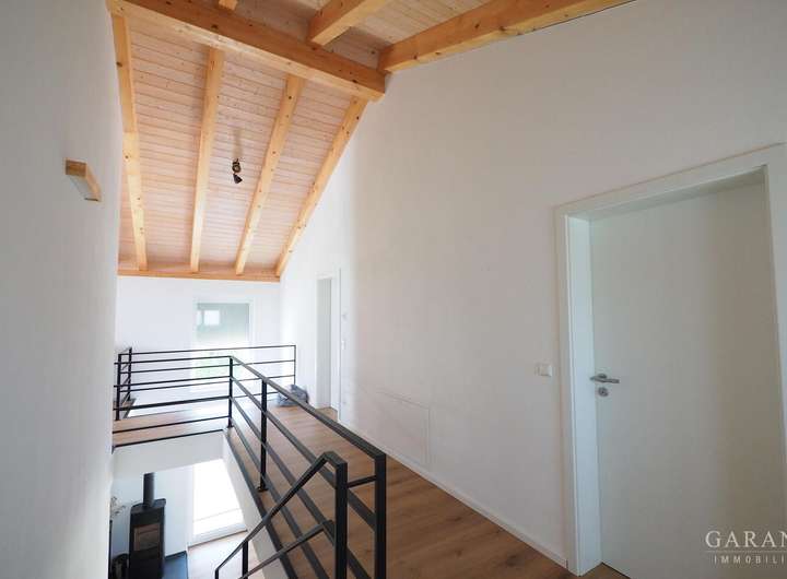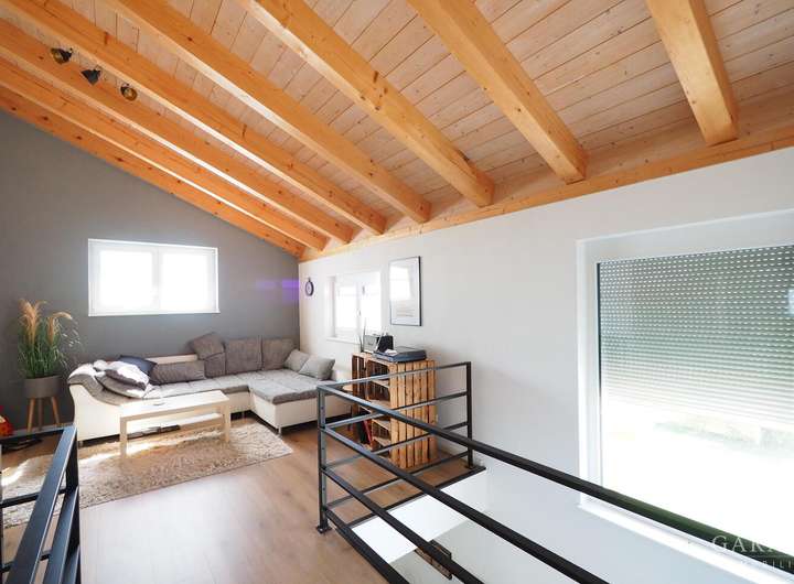 Das Obergeschoss präsentiert sich sehr großzügig im Loft-Stil. Die besondere Raumhöhe und das sichtbare Dachgebälk erzeugen eine ganz besondere Wohnatmosphäre. Hier befinden sich das Schlafzimmer mit begehbarem Kleiderschrank, ein Kinderzimmer, das zweite Bad und ein weiterer, offener Wohnbereich. Dieser lässt sich bei Bedarf mit wenig Aufwand in ein separates Zimmer umwandeln.