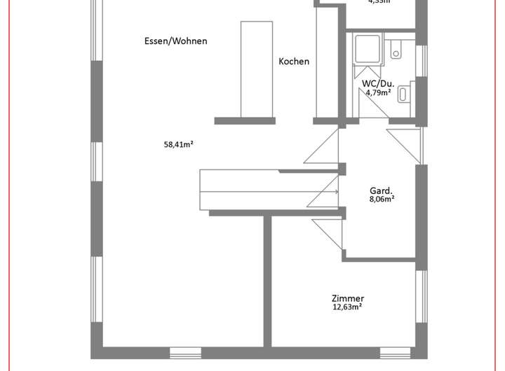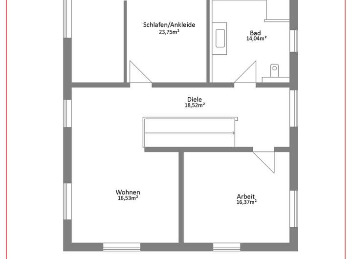 * Erdgeschoss: Flur, Bad, Zimmer, offener Wohn-/Essbereich mit