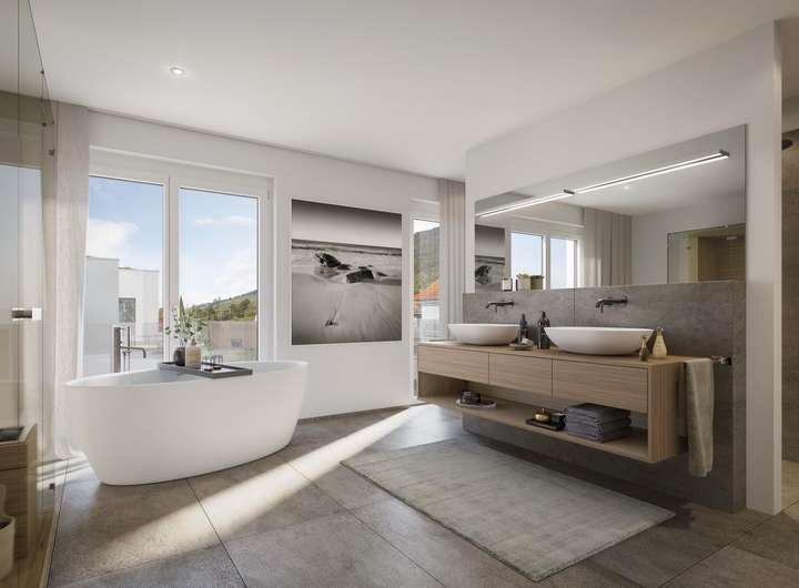 Hochwertige Sanitärobjekte und Armaturen namhafter Hersteller setzen stilvolle Akzente in den Bädern. Für die Energieversorgung kommt ein innovatives Konzept zum Einsatz: Eine Wärmepumpe sorgt effizient für Heizung, Warmwasser und Kühlung. Ergänzt wird das System durch eine Photovoltaikanlage auf dem Dach, die umweltfreundlichen Strom direkt vor Ort erzeugt.