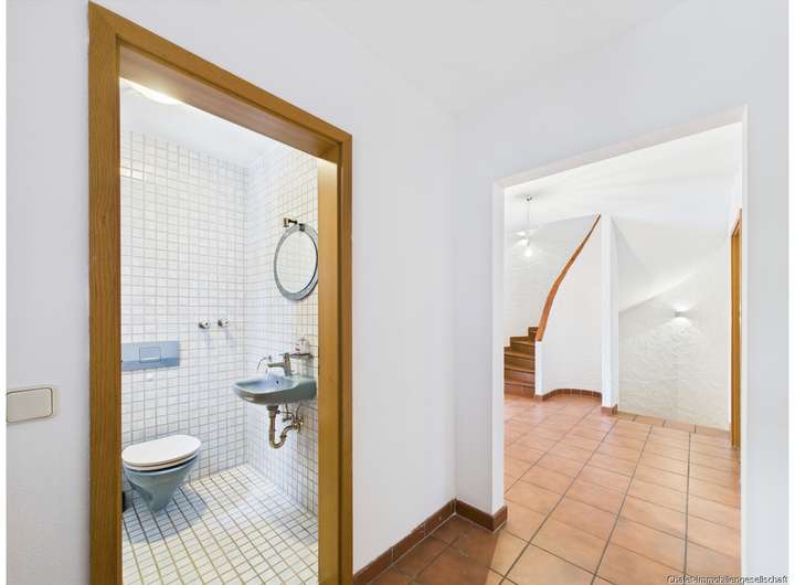 Im Erdgeschoss des Wohngebäudes befinden sich auf der Westseite die großzügig geschnittene Küche sowie das Esszimmer. Gegenüberliegend gelangt man über ein Foyer in das hübsche Gäste-WC, sowie das helle Wohnzimmer mit Blick ins Grüne. Große bodentiefe Terrassentüren geben den Blick auf den eigenen Garten frei. Ein rot-brauner Fliesenboden vermittelt ein warmes, wohnliches Raumgefühl. In allen Erdgeschossräumen sowie dem Badezimmer ist eine Fußbodenheizung verlegt.