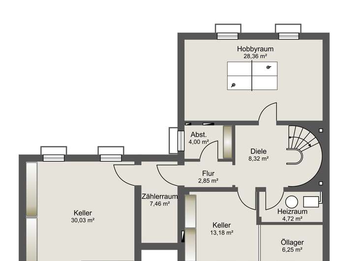 Eine Besonderheit dieses Hauses finden Sie im Untergeschoss. Da auch die Garage unterkellert wurde, wird Ihnen auch auf dieser Etage eine Menge Platz geboten. Neben der großen Diele, einer Speisekammer, einem Wäscheraum und dem Heizungsraum werden hier gleich zwei Hobbyräumen (einer beheizt) zur Verfügung gestellt. Die Beheizung erfolgt über eine Ölheizung.