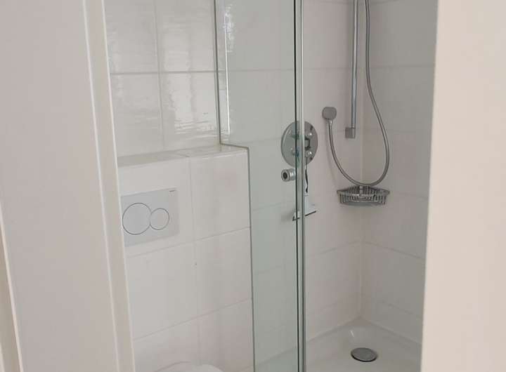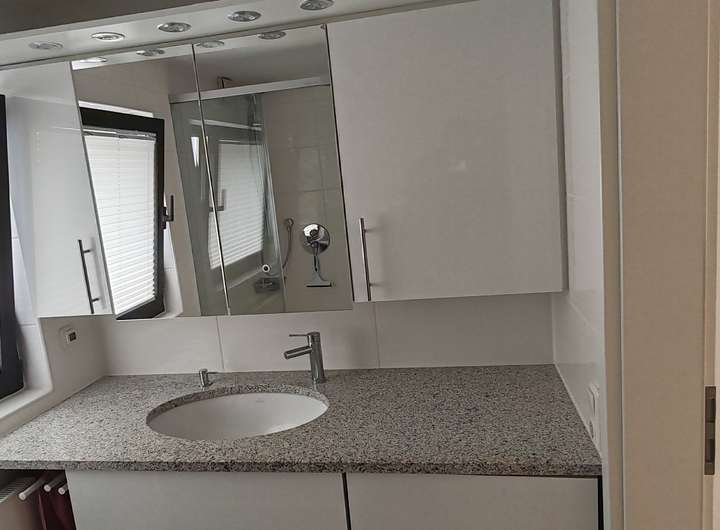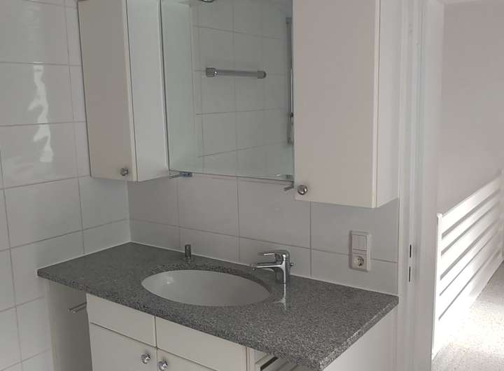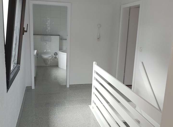 • Im Erdgeschoss befindet sich ein Duschbad, im Obergeschoss ein weiteres Bad mit Eckbadewanne. Beide Bäder sind mit Einbaumöbeln ausgestattet.