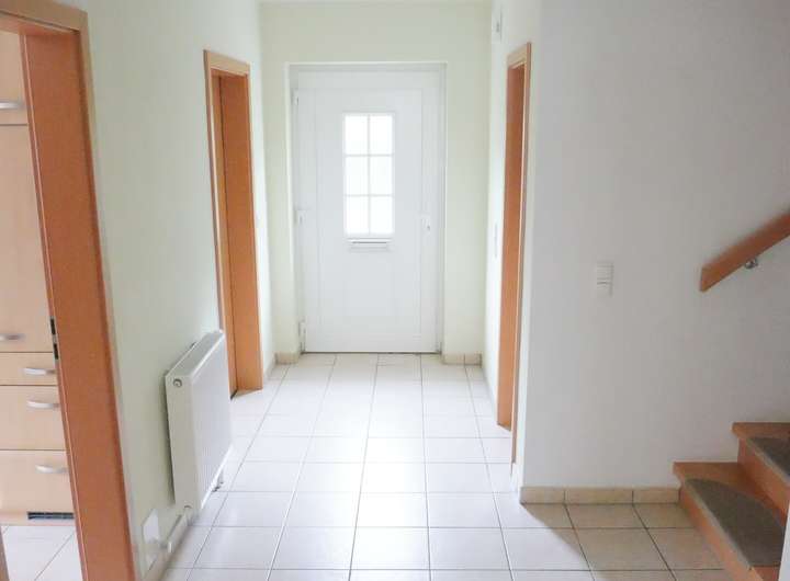 Über den Eingangsbereich gelangen wir in den großzügigen Flur der Immobilie. Von hier aus erreichen wir das Wohnzimmer mit großen Fenster- und Terrassenelementen. Der Zugang zu der überdachten Außenterrasse ist von hier aus möglich.