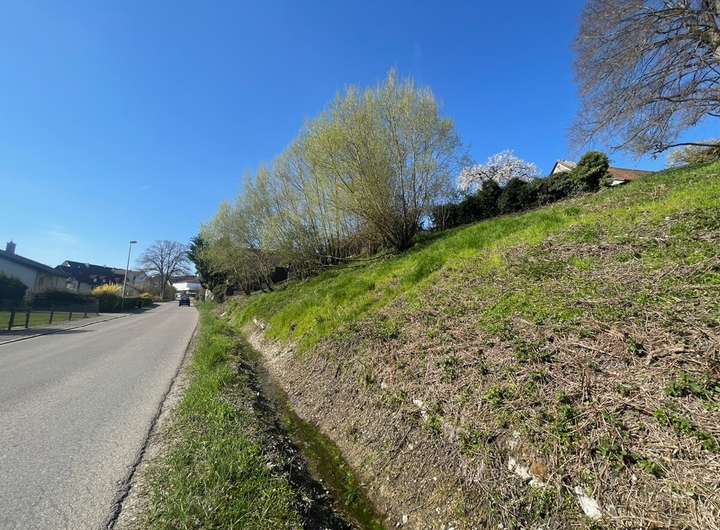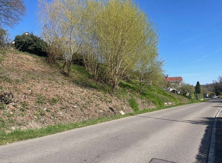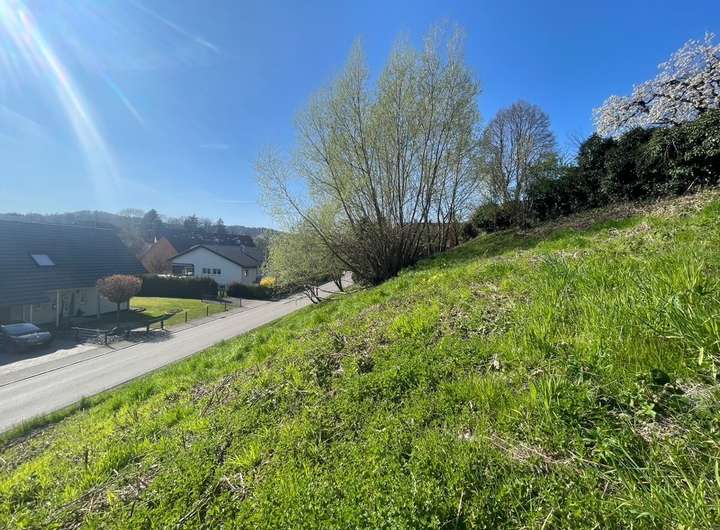 Beim Bauen auf diesem Hanggrundstück ist es empfehlenswert, das Haus teilweise ins abfallende Gelände zu integrieren. Dafür muss ein Teil des Hanges abgetragen werden. Die Außenwände im Erdreich profitieren von der gleichmäßigen Bodentemperatur und sind dadurch natürlicherweise gut gedämmt. Das Grundstück verfügt über eine eigene Quelle.