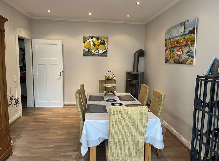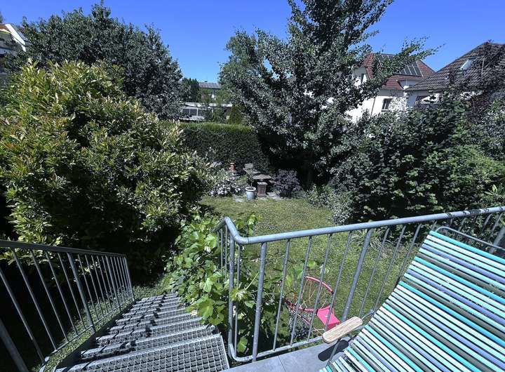 Erd- und Gartengeschoss: 5 Zimmer, 153 m², großes Wohnzimmer, Essbereich mit Kaminofen, Küche mit hochwertiger Einbauküche, Dusch- und Wannenbad, Balkon mit Zugang zum Garten und eine zusätzliche Terrasse (aktuell vom Eigentümer bewohnt, wird leer übergeben)