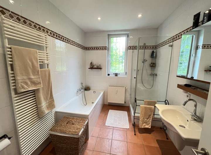 Parkettboden, Fliesen, Kaminofen, 4 Bäder, Vollkeller, 2 Einbauküchen, el. Rollläden, Sauna, Hobbyraum,