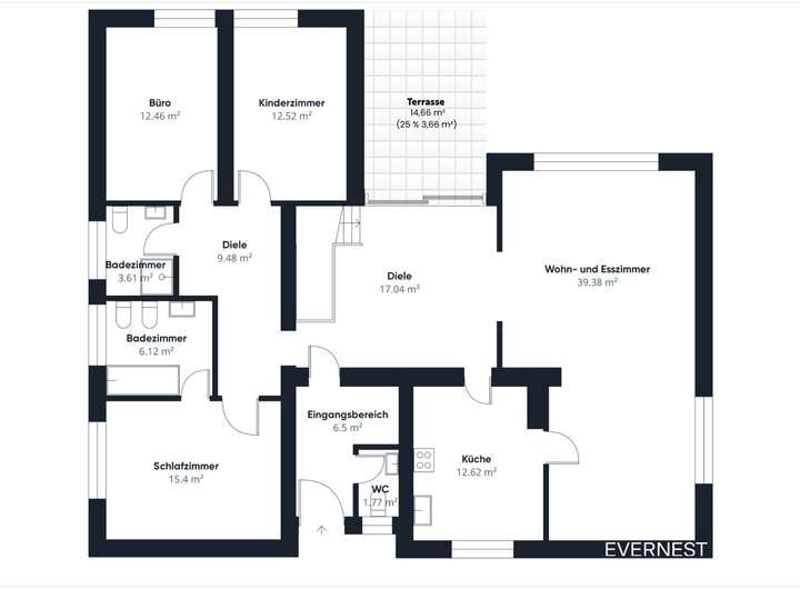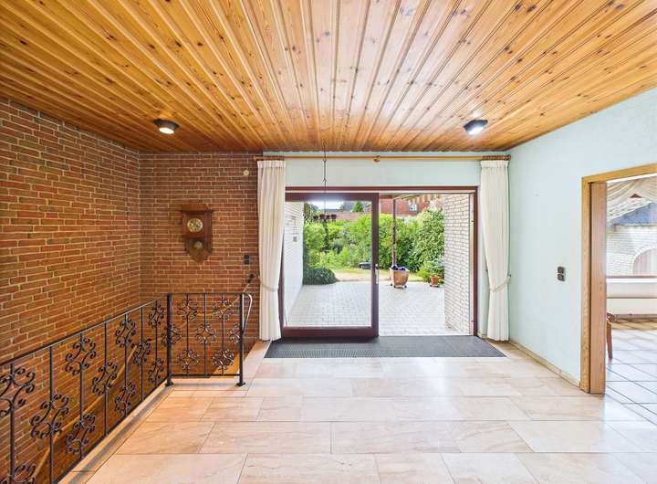 Beim Betreten des Hauses empfängt ein großzügiger Eingangsbereich die Bewohner. Von hier aus gelangt man in die zentrale Diele, die durch eine große Glasschiebetür direkten Zugang zu der überdachten Terrasse und dem Garten bietet. Der offene Wohn- und Essbereich ist lichtdurchflutet und überzeugt durch ein modernes, offenes Raumkonzept. Die derzeit separierte Küche ist über eine Tür mit dem Essbereich verbunden, lässt sich bei Bedarf aber problemlos öffnen, um einen noch großzügigeren Wohnbereich zu schaffen.