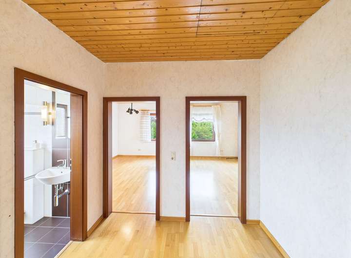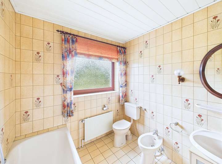 Die privaten Räume sind durch einen separaten Flur vom Gemeinschaftsbereich abgetrennt. Das Hauptschlafzimmer verfügt über ein Bad en Suite inklusive Badewanne. Zwei weitere Zimmer bieten flexible Nutzungsmöglichkeiten, sei es als Kinderzimmer, Büro oder Gästezimmer. Ein weiteres, bereits modernisiertes Bad mit ebenerdiger Dusche sowie ein separates Gäste-WC im Eingangsbereich komplettieren das Raumangebot auf dieser Ebene.
