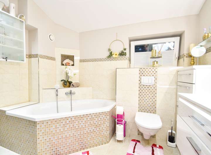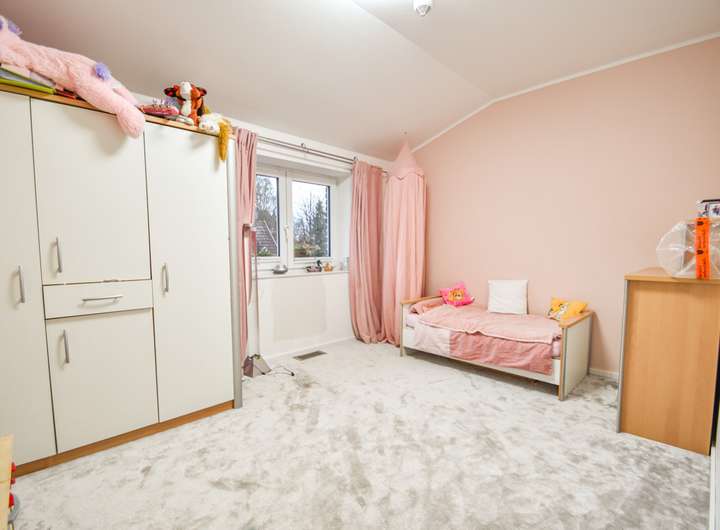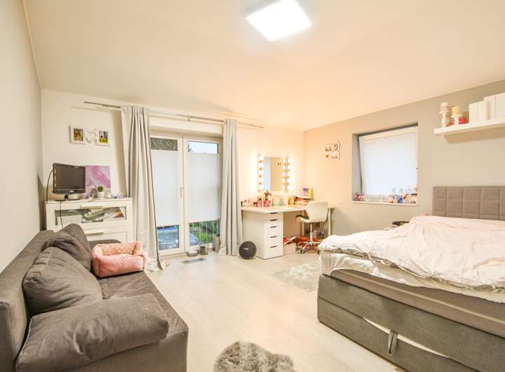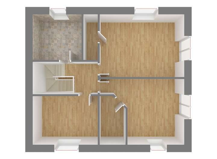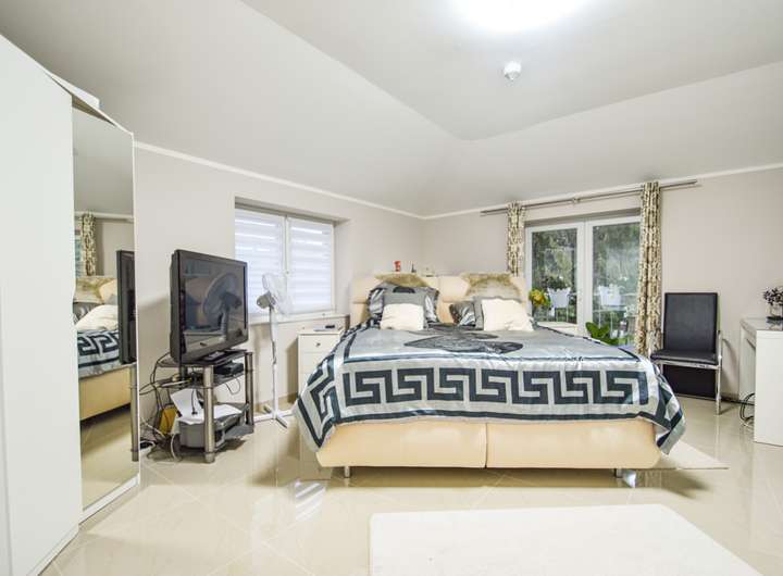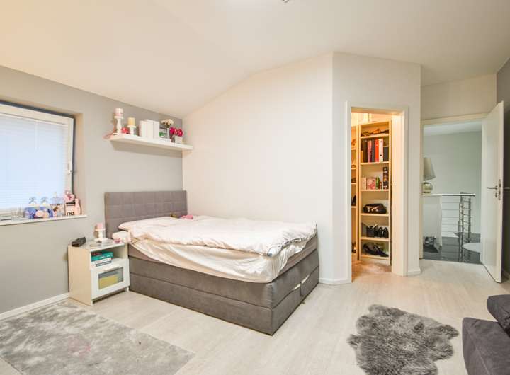 Im 1. Obergeschoss befinden sich drei Schlafzimmer, eins davon mit Ankleide, sowie ein Vollbad mit Dusche und Badewanne.