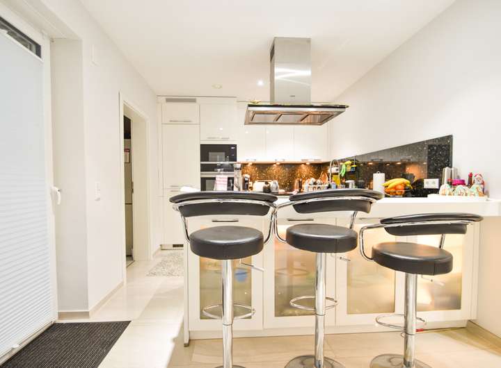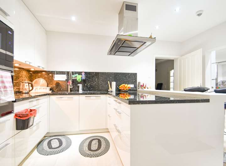 Die Küche präsentiert sich modern: ausgestattet mit einer Kochinsel und durch eine Schiebetür vom Wohn- und Esszimmer trennbar. Ein angrenzender Abstellraum bietet zusätzlichen Stauraum.