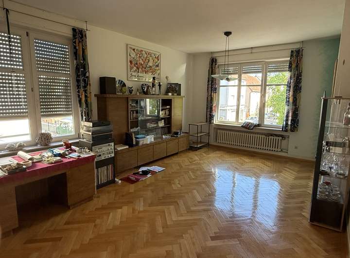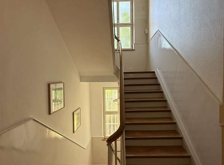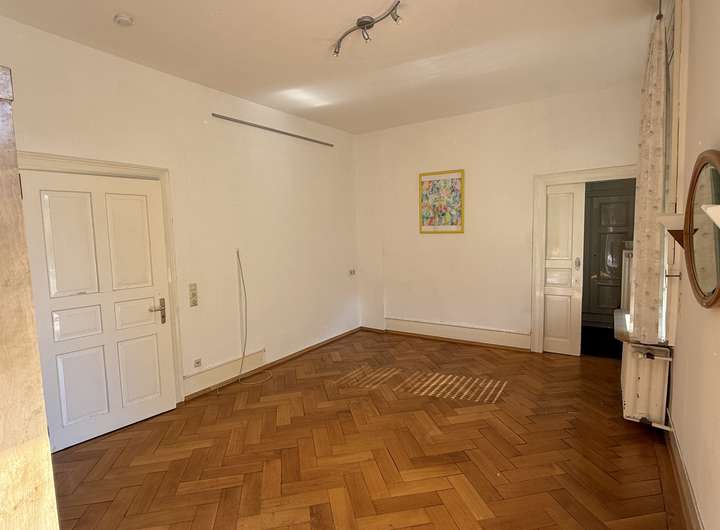 Die Großzügigkeit und Eleganz spiegelt sich inmittem der massiv erbauten Außenwände durch die hohen Räume mit großen Fensterflächen und dem Fischgrätparkett wieder.