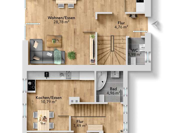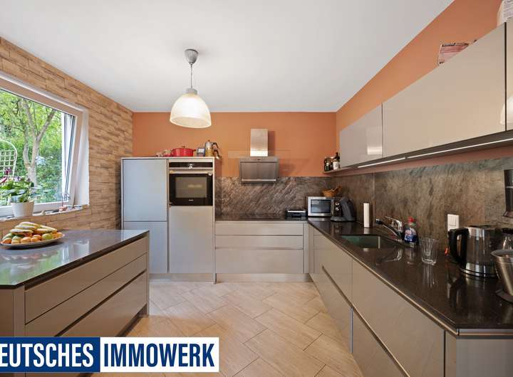 Das hintere Haus empfängt Sie im Erdgeschoss mit einem offenen Grundrisskonzept. Ein einladender Flur, ein Gäste-WC sowie ein lichtdurchfluteter Wohn- und Essbereich mit integrierter offener Küche schaffen ein modernes und großzügiges Wohlgefühl. Das Herzstück der Immobilie ist der lichtdurchflutete offene Wohn- und Essbereich. Hier ist genügend Platz für ein gemütliches Zusammentreffen mit der Familie auf dem Sofa samt Fernsehecke sowie für einen großen Esstisch. Aus den zahlreichen Fenstern schauend, erblicken Sie den liebevoll angelegten Garten. Von hier aus erhalten Sie durch die bodentiefen Fenster/-türen direkten Zugang zur Terrasse. In beiden Wohneinheiten sind die Küchen mit allen erforderlichen Unter- und Oberschränken sowie Elektrogeräten ausgestattet, die im Objekt bestehen bleiben.