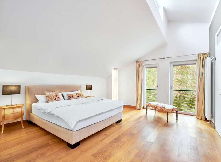 - Eichen-Dielenparkett in den Wohn- und Schlafräumen; Feinsteinfliesen in Naturstein-Optik in der Diele, in den Bädern und weitgehend im Untergeschoss, die Feinsteinflächen besitzen Fußbodenheizung