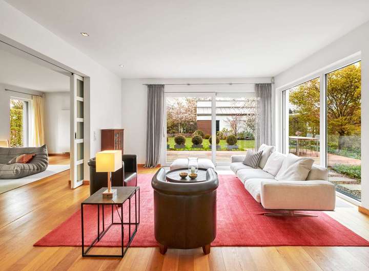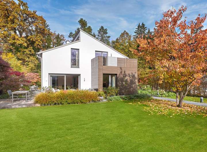 Eine elegante Miele-Küche, ein holzbefeuerter Kamin, Eichen-Dielenparkett, ein Sicherheitskonzept und puristische Badgestaltung schaffen ein exklusives Wohnumfeld, das bei aller Klarheit ein besonderes Wohlfühlambiente vermittelt. Ein absolutes Highlight ist der professionell angelegte Süd-West-Garten mit zwei sonnigen Terrassen und einem idyllischen Waldbereich, der in dem Bildband „100 Traumgärten in Deutschland“ vorgestellt wurde. Komplettiert wird dieses Familiendomizil durch eine Doppelgarage mit Wallbox. 2020 wurde eine Photovoltaik-Anlage installiert und 2022 eine Luft-Wärmepumpe eingebaut.