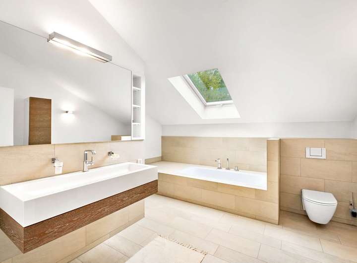 - Hauptbad, gestaltet mit sandfarbenem Feinstein in Naturstein-Optik, ausgestattet mit Wanne (Duravit), bodengleicher Walk-in-Dusche einschl. Rainshower und Shampoo-Nische, breitem Waschtisch einschl. Unterschrank, WC (Starck für Duravit), beleuchtetem Spiegel, zwei wandmontierten Badschränken, Fußbodenheizung und Handtuchheizkörper
