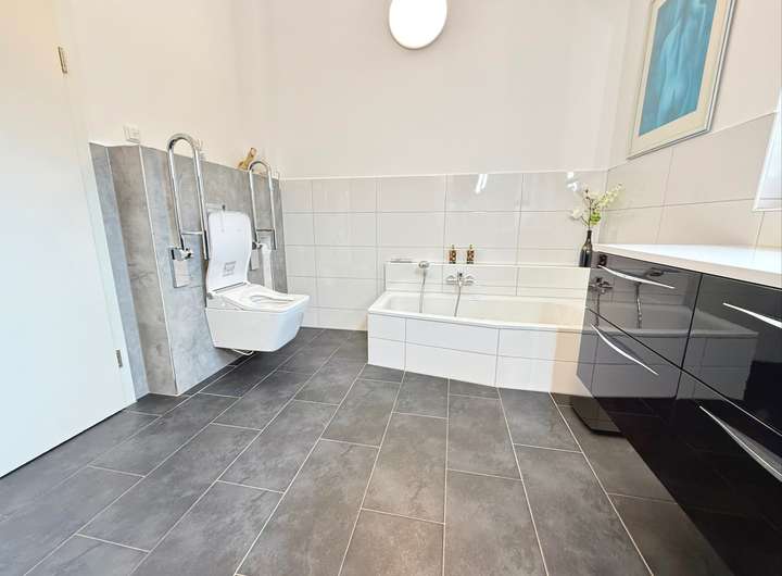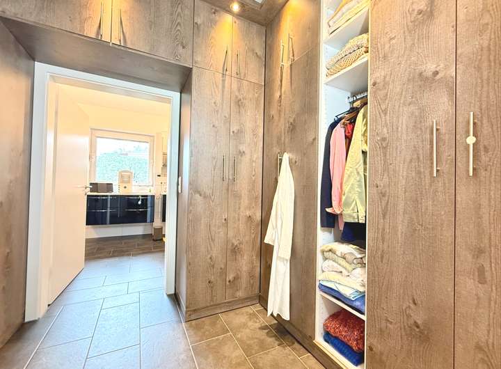Besonders clever: Das Elternschlafzimmer ist separat abgetrennt und bietet Privatsphäre pur. Von dort gelangt man direkt in das Ankleidezimmer und weiter in das luxuriöse Badezimmer, das 2025 aufwändig saniert wurde. Dieses private Spa beeindruckt mit bodengleicher Dusche, edler Ausstattung und einer japanischen Hightech-Toilette, die mehr kann als so manche App. Hier beginnt der Tag mit einem Lächeln – versprochen!