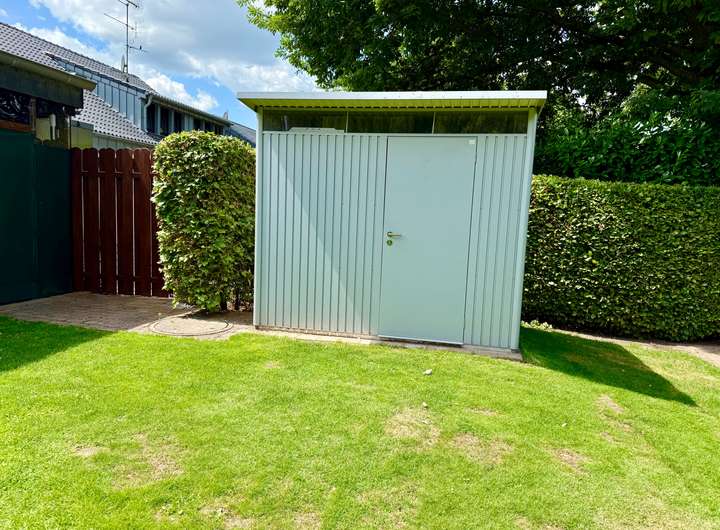 Natürlich gibt’s auch reichlich Platz für alles Praktische: Ein Gerätehaus, ein Müllplatz mit Verkleidung, eine große gepflasterte Auffahrt für drei Fahrzeuge sowie eine Garage mit Carport-Erweiterung. Sogar die Hausanschlüsse wurden vom Schreiner verkleidet – weil eben auch das Unsichtbare stilvoll sein darf.