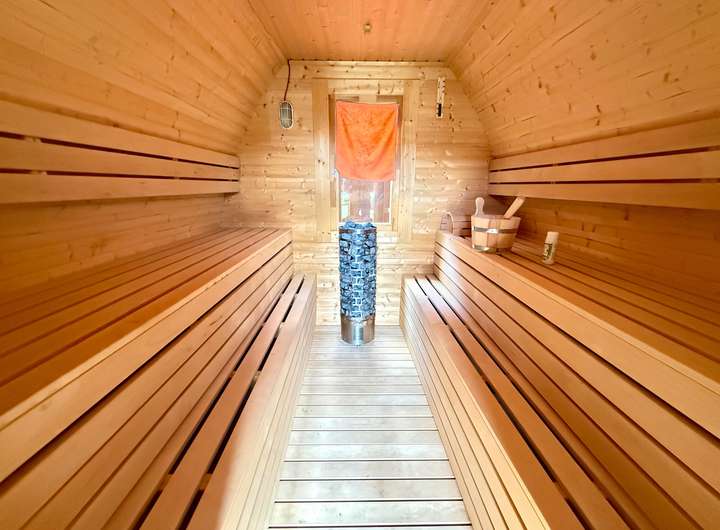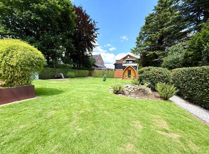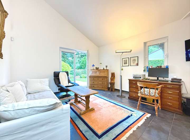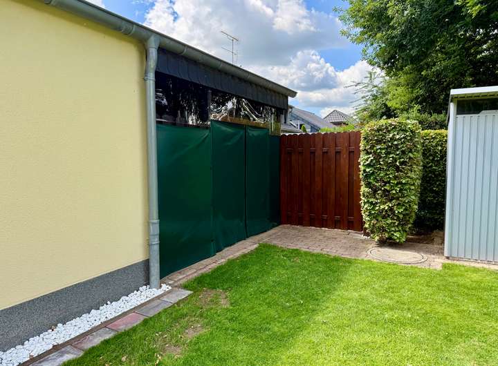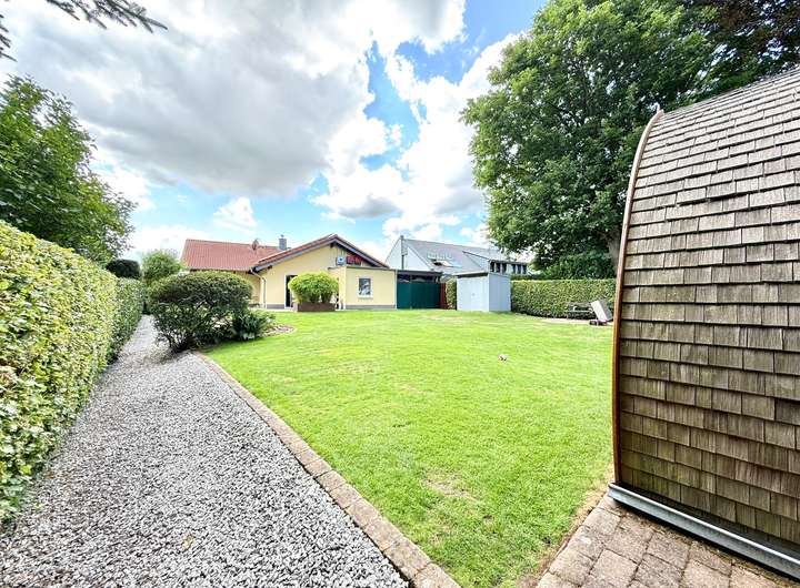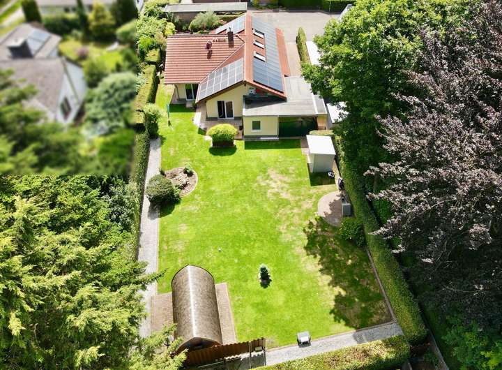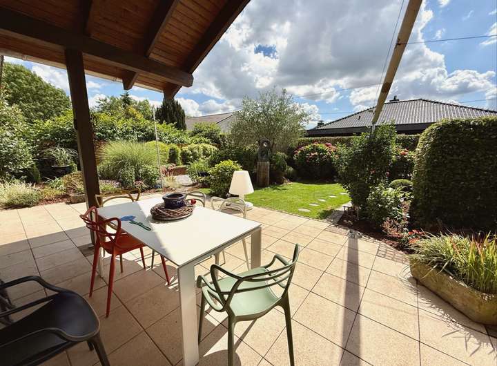 Draußen geht das Staunen weiter: Zwei große Terrassen bieten Sonnen- und Schattenplätze für jede Tageszeit, eine gepflegte Gartenanlage mit automatischer Bewässerung, Design-Hochbeeten aus Roststahl, einer charmanten Außensauna mit Schindeldach und einem rundum eingefriedeten Grundstück laden zum Entspannen, Gärtnern oder einfach zum Genießen ein. Besonders erwähnenswert: Das aufwändig nachgerüstete, große vollelektrische Sonnensegel, das per Knopfdruck für angenehm schattige Plätze sorgt – stilvoll, komfortabel und technisch vom Feinsten. Die liebevoll angelegte Buchenhecke schützt vor neugierigen Blicken, und für alle Fälle gibt es sogar ein clever gelöstes Extra: Ein Wegerecht über das Nachbargrundstück ermöglicht den Zugang zum Garten mit schwerem Gerät – falls Sie also jemals einen Pool bauen oder einen ausgewachsenen Olivenbaum einfliegen lassen möchten – hier stehen Ihnen alle Wege offen.