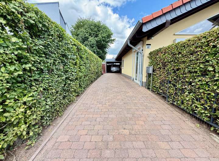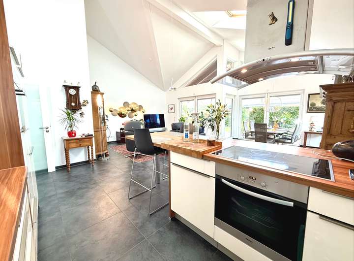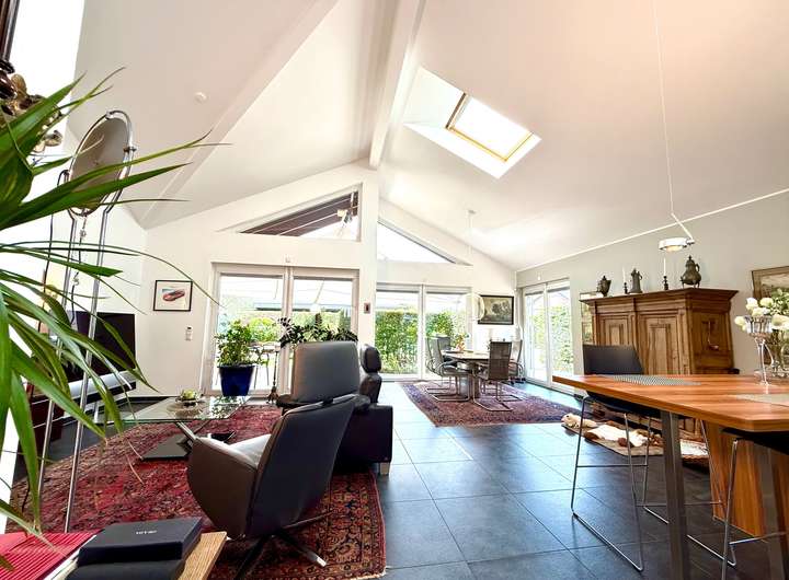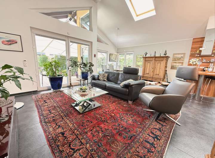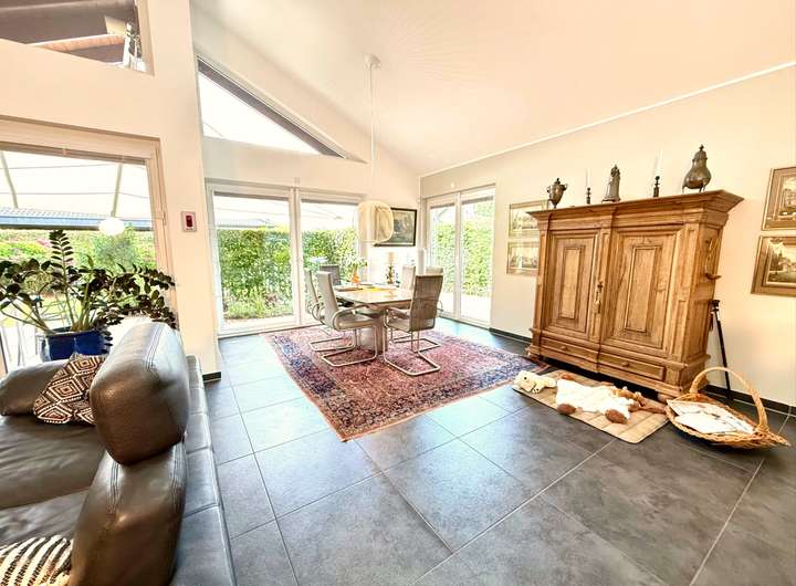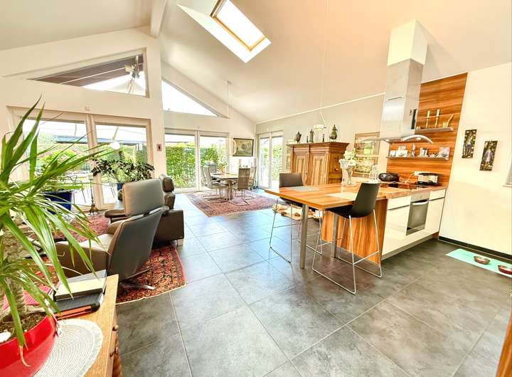 Schon beim Betreten des rund 137,99 m² großen, eingeschossigen Bungalows wird klar: Hier wurde nicht gespart – weder an Raum, noch an Ausstattung. Die außergewöhnlich hohe Deckenhöhe von bis zu 5 Metern durchzieht das gesamte Haus und schafft eine Wohnatmosphäre, die ihresgleichen sucht. Großzügig, lichtdurchflutet und dabei stets wohnlich, so fühlt sich echtes Raumgefühl an.