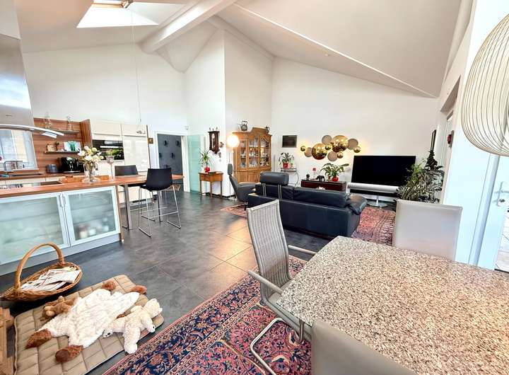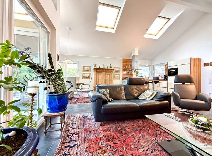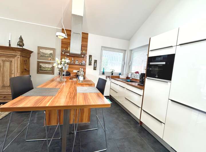 Der durchdachte Grundriss überzeugt auf ganzer Linie: Das Herzstück bildet das rund 50 m² große Wohn-/Esszimmer mit offener Küche – modern, offen, kommunikativ. Hier spielt sich das Leben ab. Vom gemütlichen Filmabend bis zur geselligen Dinnerparty an der Kochinsel ist alles möglich. Die Küche ist ausgestattet mit hochwertigen Markengeräten, Dampfgarer, Induktionskochfeld und stilvoller Möblierung, die nicht nur funktional, sondern auch ein echter Hingucker ist.