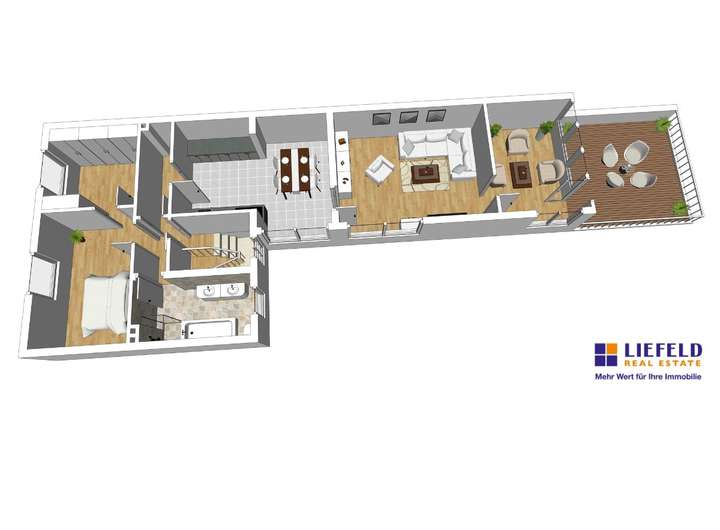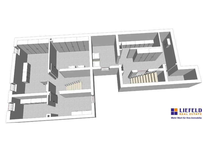 Die Aufteilung entnehmen Sie bitte den beigefügten Grundrissen. Hinweis: Die dargestellte Möblierung, außer den vorhandenen Einbauküchen, gehört nicht zum Verkaufsgegenstand.