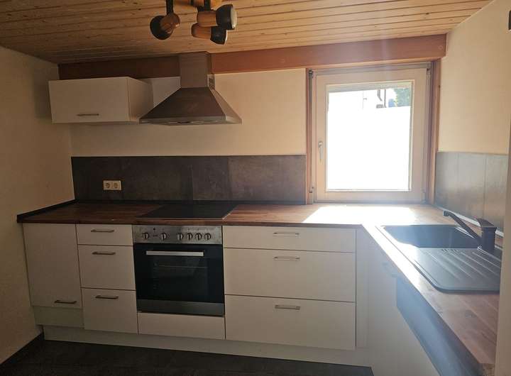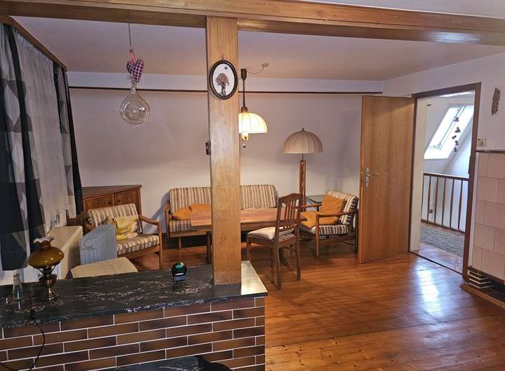 Über eine Holztreppe gelangt man vom UG zum EG in die große 4-Zimmer-Wohnung mit ca. 92m² Wohnfläche. Diese Wohnung wurde vor einigen Jahren im Landhausstil ausgebaut und eingerichtet. Eine Einbauküche ist in dieser Wohnung vorhanden.