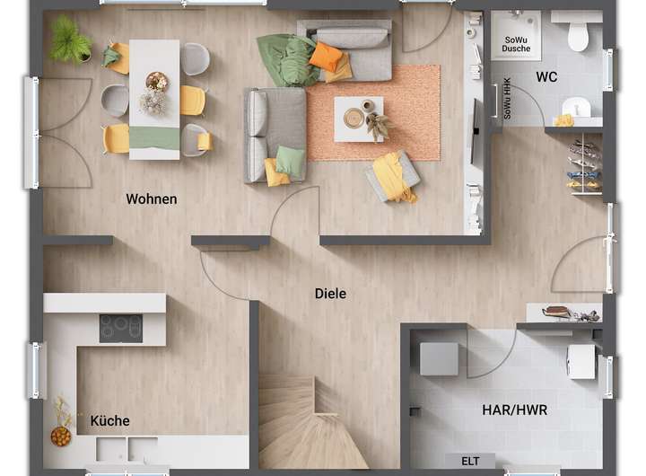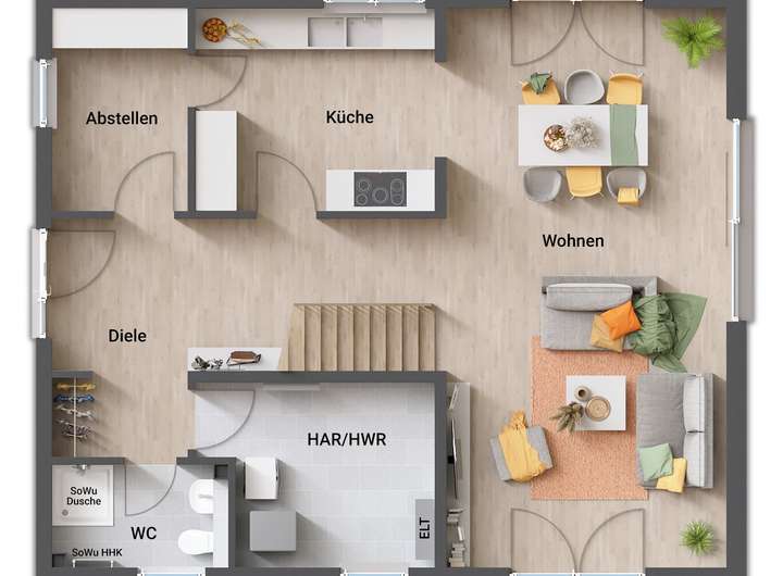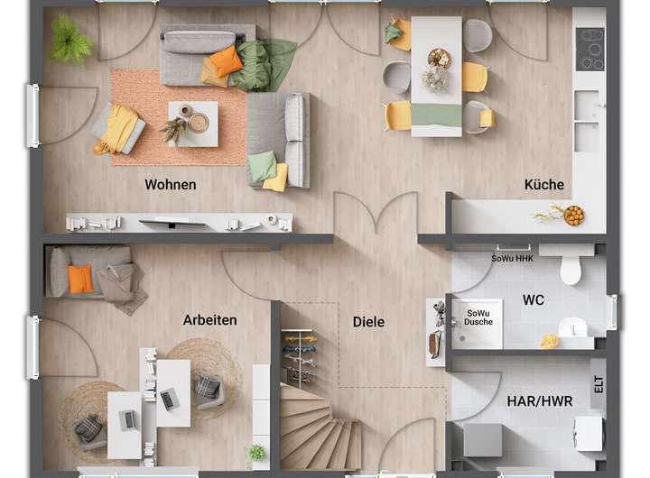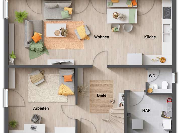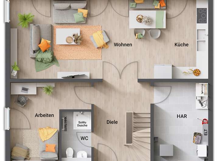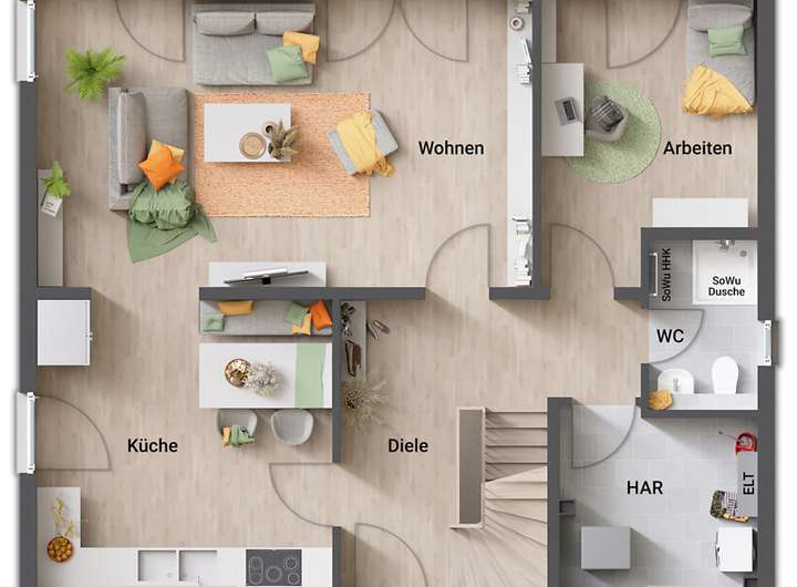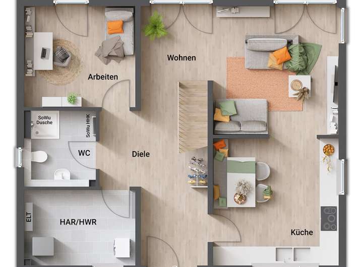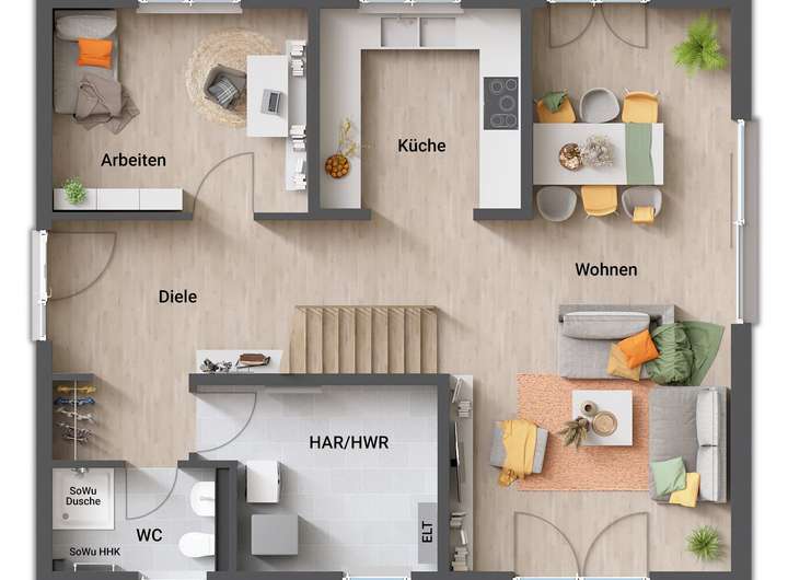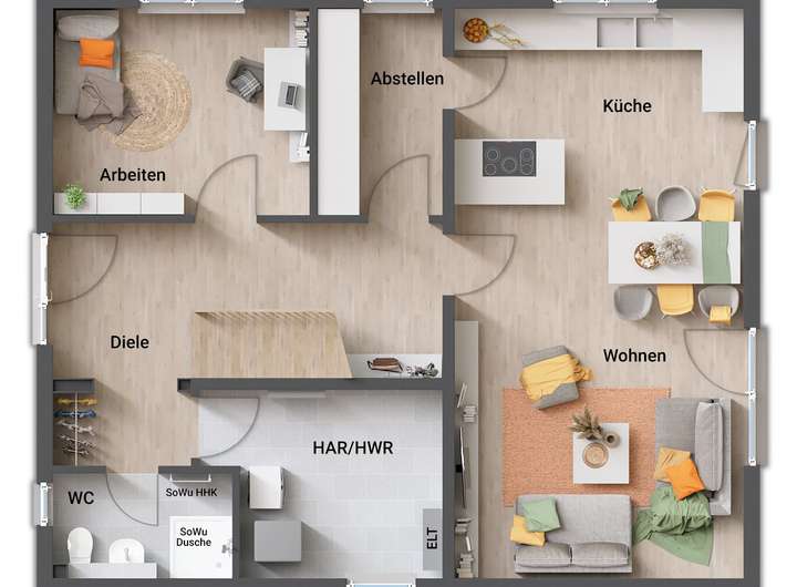 In der Küche haben Sie genug Platz für gemeinsame Kochabende mit den Liebsten oder ein schnelles Frühstück unter der Woche. Wer hin und wieder lieber im Home-Office arbeitet, kann sich neben dem Wohnzimmer ein Arbeitszimmer einrichten.