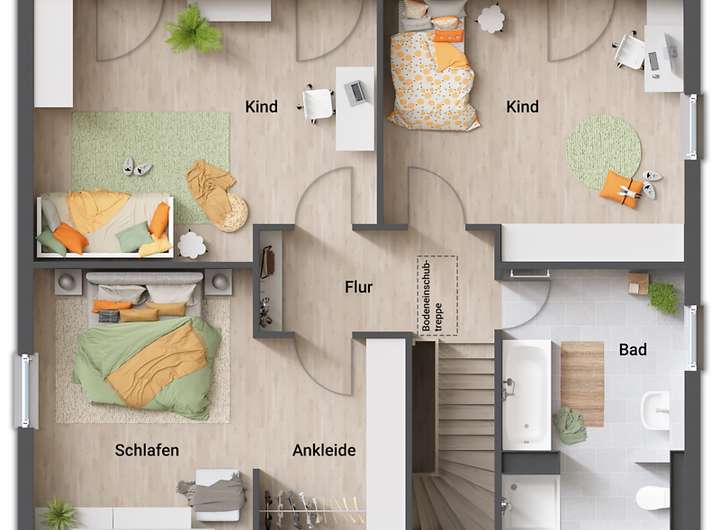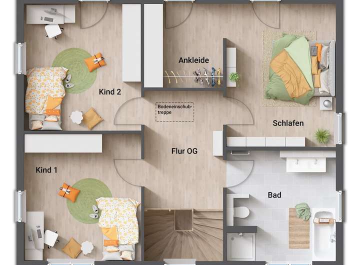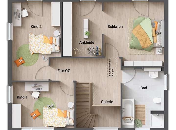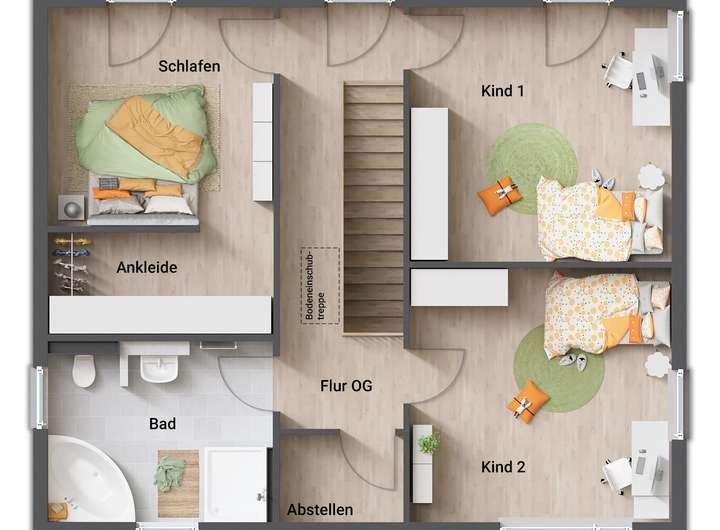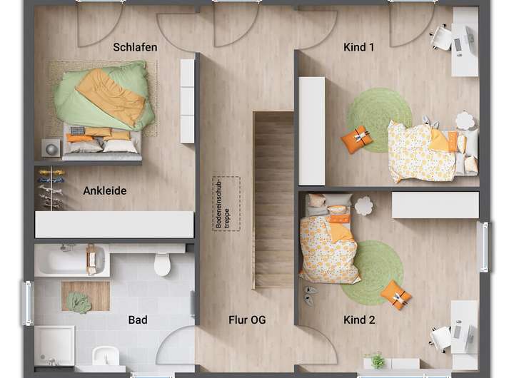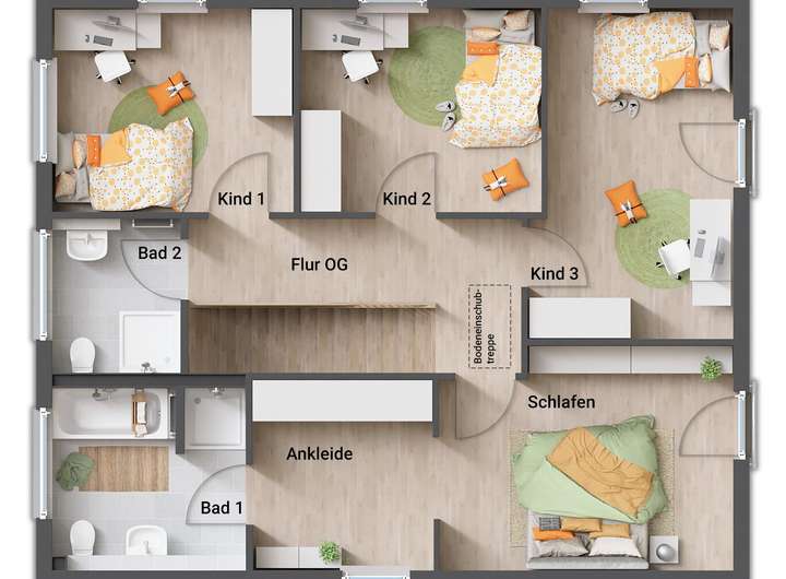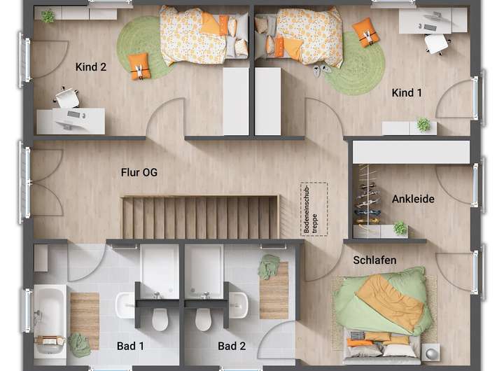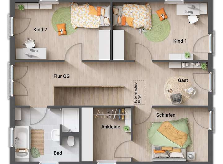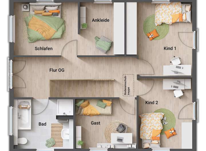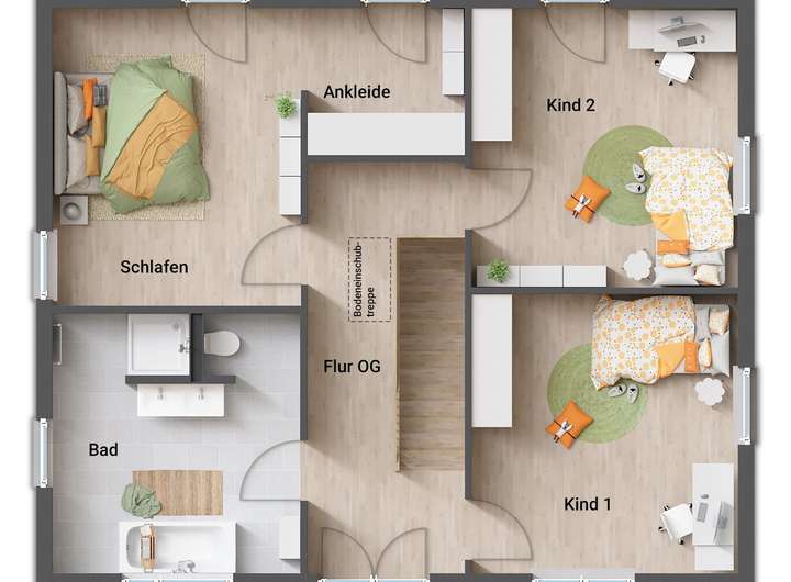 Auch das Obergeschoss zeigt sich im gradlinigen Baustil des Hauses. Hier finden Sie drei Zimmer, die Sie nach Ihren Vorstellungen als Schlaf-, Kinder- oder Gästezimmer nutzen können. Große Fenster lassen auch hier viel Tageslicht hineinströmen. Die Ankleide im Schlafzimmer bietet viel Stauraum.