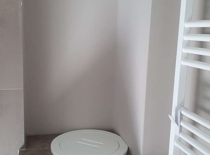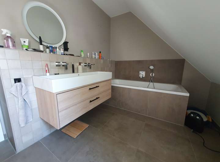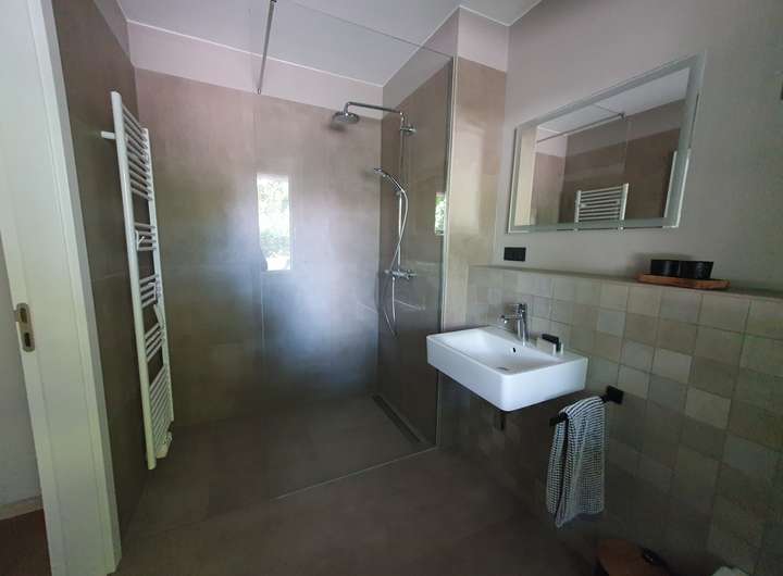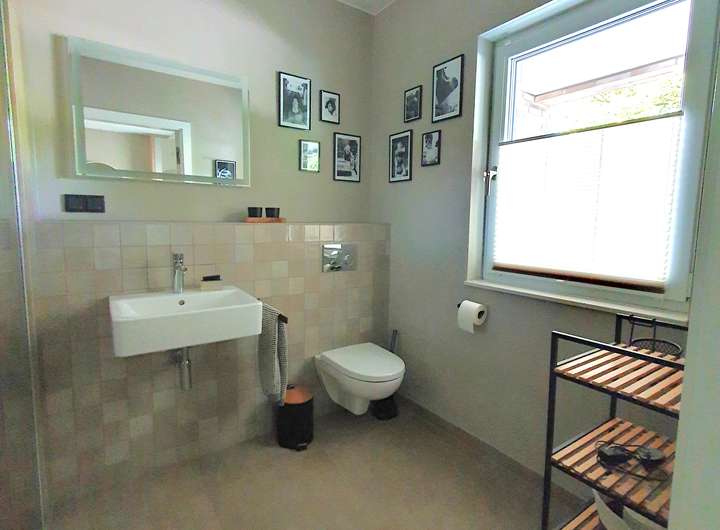 Bodenbelag in den Bädern: großformatige Fliesen 60x60 cm in