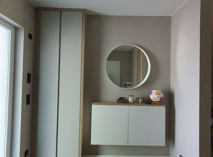 Ein maßgefertigter Einbauschrank im Obergeschoss fügt sich nahtlos in die Architektur ein und sorgt für ein einheit-liches, harmonisches Wohngefühl.