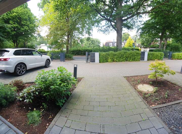 Das Grundstück ist komplett eingezäunt. Das Tor zur Straße hin ist selbstverständlich elektrisch steuerbar. Die Grundstücksfläche des Gebäudes beläuft sich auf ca. 802 m² (inklusive der ca. 98 m² großen gemeinschaftlich genutzten Auffahrt). Das gesamte
