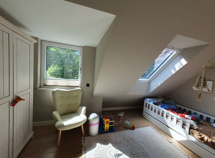 Ausgebauter Spitzboden (Spielzimmer / Homeoffice) mit jeweils 2 Giebelfenstern und 2 Dachflächenfenstern
