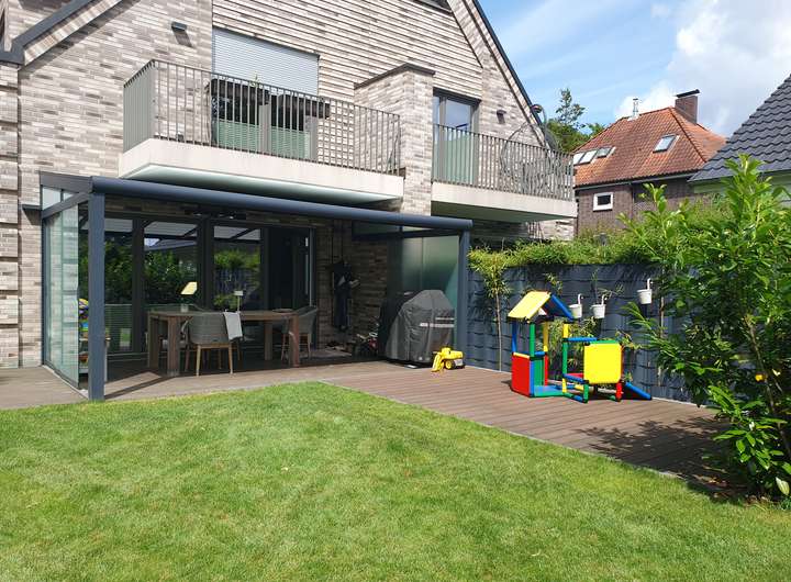 Eine überdachte Terrasse bietet zu jeder Jahreszeit einen gemütlichen Platz im Freien. Erlesene Materialien und hochwertige Ausstattungsdetails garantieren einen luxuriösen Lebensstil.