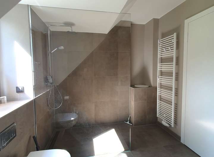 Beide Bäder: bodengleiche Dusche mit Duschrinne, Grohe-Thermostat-Armatur und großer Regenbrause, maßgefertigte Glasduschwand, wandhängende WC-Anlage mit