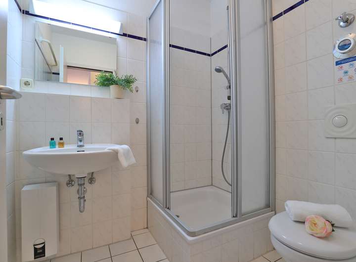 Die Eigentumswohnung verfügt über ein hell gefliestes Duschbad mit Waschtisch und WC.