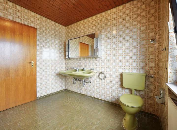 Ein grün gefliestes Tageslichtbad mit Wanne und separater Dusche rundet diesen Bereich ab. Die Originalausstattung ist gepflegt und wartet auf neue Ideen, bietet aber bereits heute den Charme vergangener Wohnkultur.