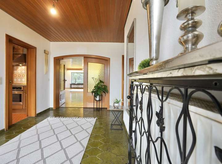 Sie betreten das Haus über eine breite Treppe, nur ein paar Stufen hinauf und Sie stehen direkt in einer hellen, großzügigen Diele, die mit ihren tiefgrünen Originalfliesen den eleganten Zeitgeist der 70er Jahre atmet. Die edlen Fliesen – einst ein luxuriöses Statement – sind nicht nur hervorragend erhalten, sondern verleihen dem Raum eine angenehm kühle Eleganz.