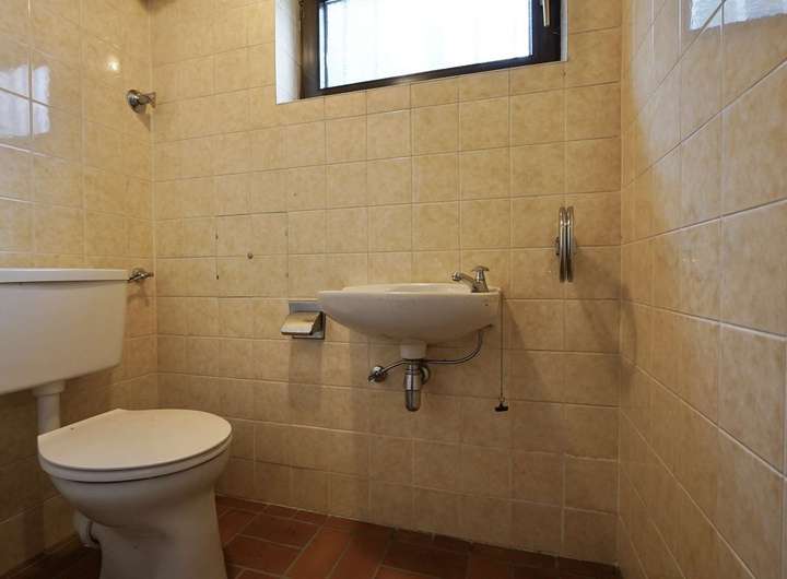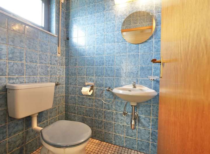 Zur Linken entdecken Sie eine diskret abgetrennte Garderobennische und gleich daneben ein Gäste-WC, komplett im originalen blauen Fliesendesign jener Zeit – ein Retro-Traum, der sich mühelos in moderne Konzepte umwandeln lässt.