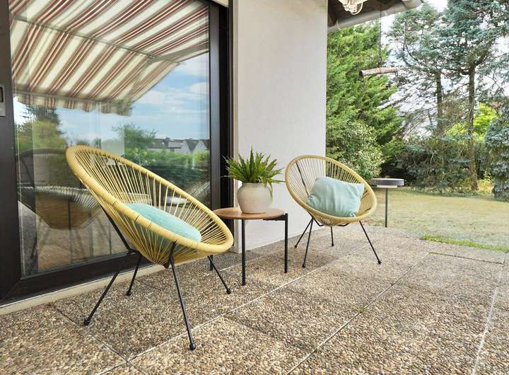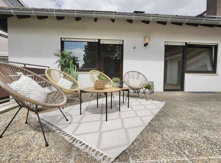 Die Fenster sind mit elektrischen Rollläden und Einbruchsicherungen ausgestattet – durchdacht, solide, sicher. Von hier gelangen Sie direkt auf die rund 50 m² große, sonnenverwöhnte Terrasse, überdacht von einer elektrischen Markise – ideal für lange Sommerabende, Grillfeste oder ganz einfach Ruhe im Grünen. Der Garten bietet viel Platz für neue Ideen! Ob Pool, die lang ersehnte Outdoorküche oder ein Kinderkletterparadies - hier können Sie sich austoben!