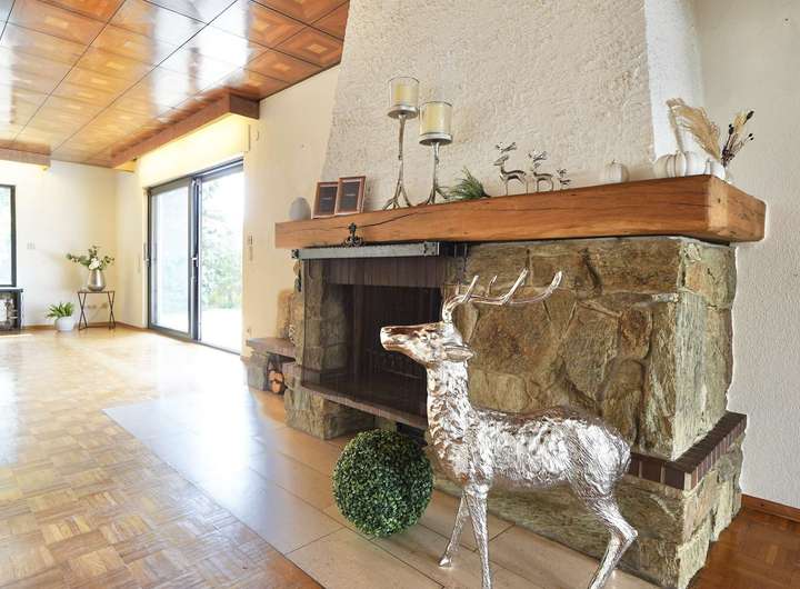 Hier eröffnet sich ein wahrer Wohntraum: Original Stäbchenparkett, ein imposanter Kamin als Blickfang, und die großen Fensterfronten mit Blick in den Garten schenken dem Raum Licht, Luft und Leben.