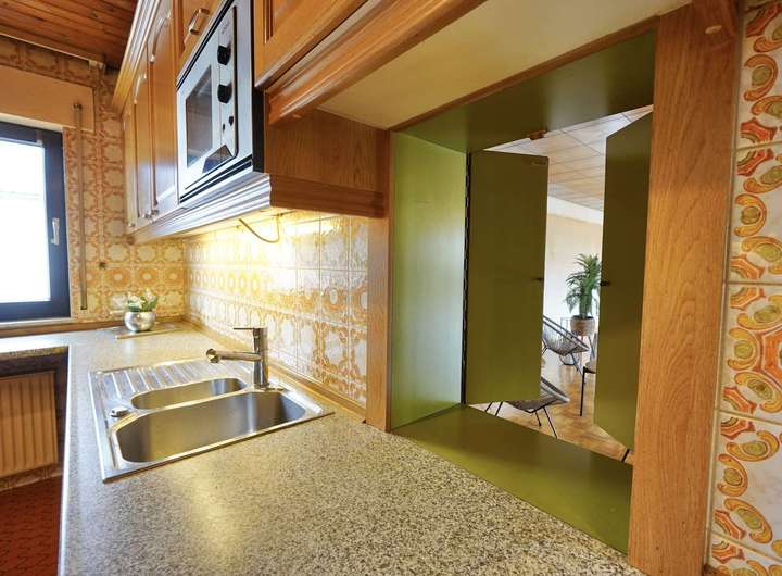 Direkt angrenzend liegt die charaktervolle Küche in warmen Orangetönen, ebenfalls aus dem Baujahr. Hier spürt man: Kochen war schon damals mehr als eine Notwendigkeit – es war ein Lebensgefühl. Eine praktische Speisekammer ergänzt den Raum, und durch eine charmante Durchreiche lässt sich das Essen direkt ins Wohnzimmer weitergeben – eine kleine Hommage an die Gastfreundschaft vergangener Zeiten.