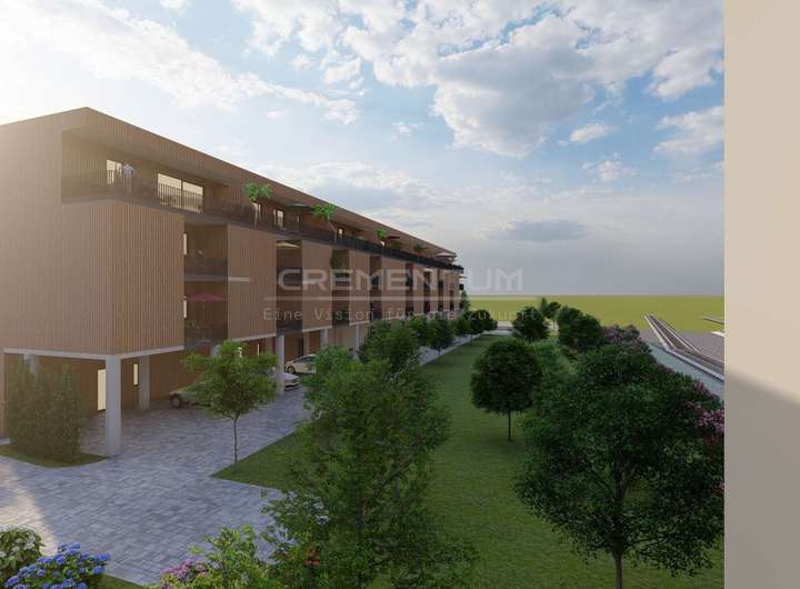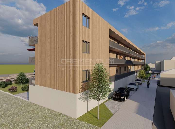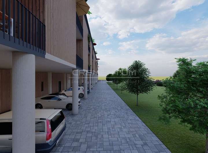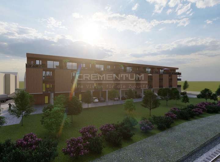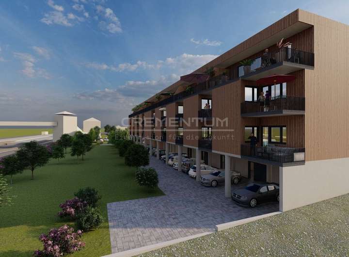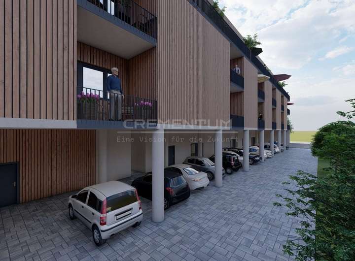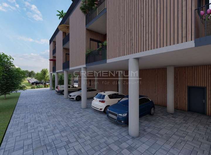 Der Gebäudekomplex besteht aus einem zusammenhängenden Baukörper, unter dem ein oberirdisches Parkdeck mit insgesamt 24 überdachten und 3 freien Stellplätzen integriert ist. Diese Lösung gewährleistet eine effiziente Flächennutzung und bietet den Bewohnern sowie Besuchern komfortablen und wettergeschützten Parkraum direkt am Gebäude.