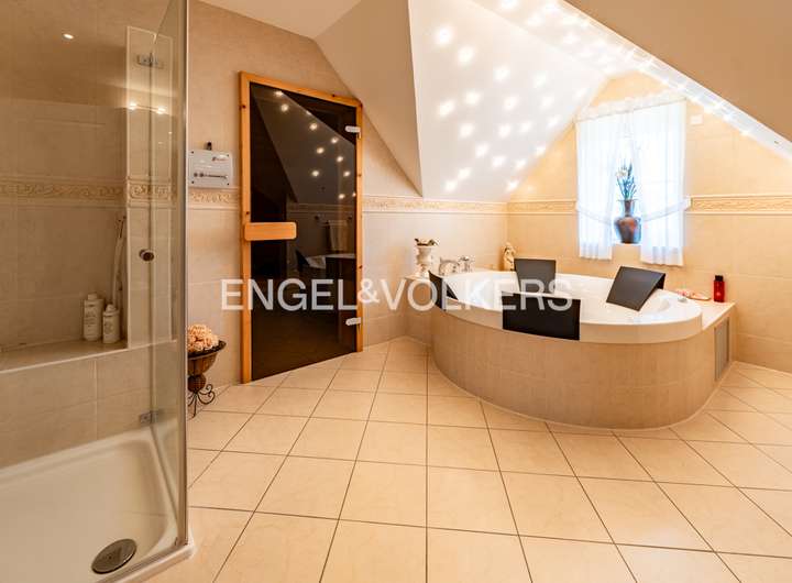 Das Dachgeschoss überzeugt mit einem großen Schlafzimmer samt Ankleide, einem weiteren Zimmer, einem Hauswirtschaftsraum sowie dem Heizungsraum. Ein echtes Highlight ist das großzügige Badezimmer mit Whirlpool-Badewanne, privater Sauna und Zugang zum Balkon mit Blick ins Grüne.