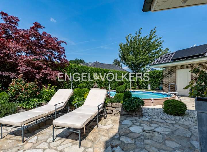 Im Erdgeschoss erwarten Sie ein einladender Eingangsbereich, ein Gästezimmer mit eigenem Duschbad, ein heller Wohn- und Essbereich sowie eine separate Küche mit Teppanyaki-Fläche und praktischem Abstellraum. Der direkte Zugang zu zwei Terrassen und dem liebevoll gestalteten Garten mit Pool schafft echtes Urlaubsgefühl. Der Pool ist beheizt und somit auch an kühleren Tagen nutzbar. Die angrenzende Garage bietet eine Wallbox zum Laden von E-Fahrzeugen sowie eine separate Werkstattfläche – ideal für Hobby-Handwerker.