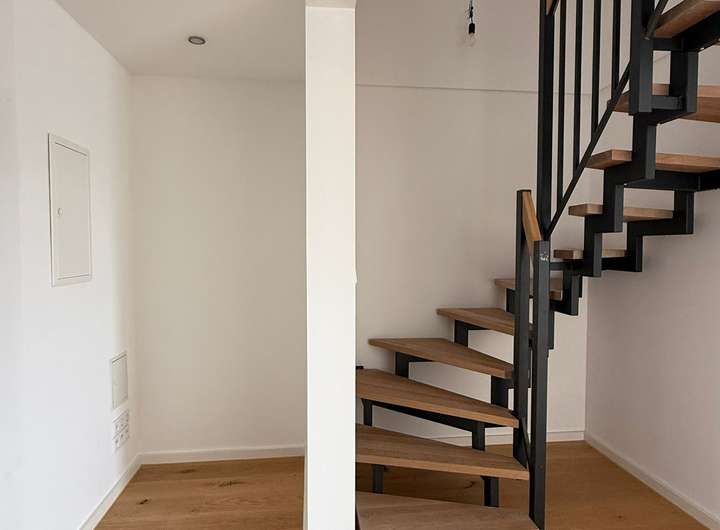 Eine elegante Wendetreppe verbindet die beiden Wohnebenen harmonisch.